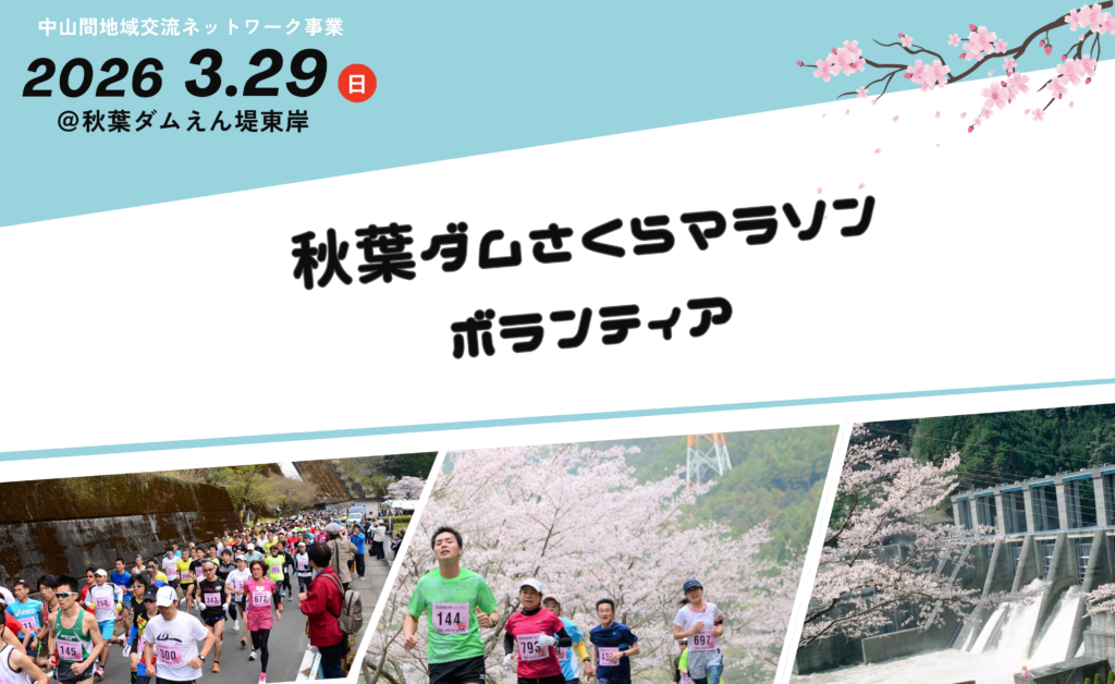 秋葉ダム湖畔の桜並木の下をのんびり楽しく走る「秋葉ダムさくらマラソン」。今年で49回目を迎える歴史の長いイベントです。例年、実行委員会を中心に地元ボランティアで開催・運営してきましたが、人口減少や高齢化によって大会運営が年々難しくなってきています。そのため、皆さんボランティアの力が必要不可欠となっております。 ボランティアに参加してくださった方には、地元特産品をプレゼントします。また、当日は桜まつりを同時開催する予定ですので、そちらもお楽しみいただけます。